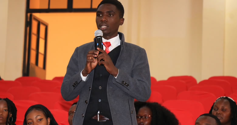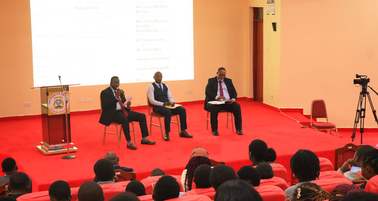 Discussant Adv. David Njoroge addressing the Students, on-looking Dr. Johana Kambo, Dean SoL (Centre) and Hon. Justice Richard Mwongo.